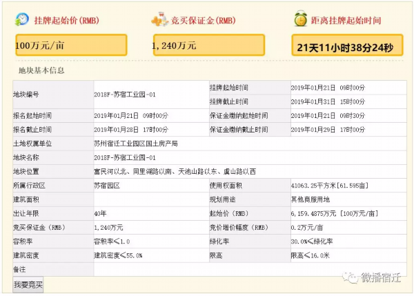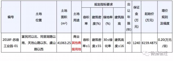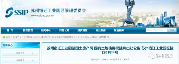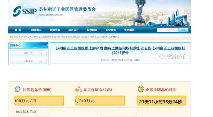 12月29日,苏州宿迁工业园区国土房产局发布《国有土地使用权挂牌出让公告 苏州宿迁工业园区挂[2018]F号》,以挂牌方式出让1(幅)地块的国有土地使用权。