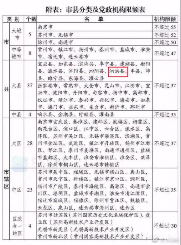 泗洪县升级啦!以往大家经常开玩笑说自己是“大泗洪”人,现在,根据江苏省最新认定,中央编委正式备案同意,泗洪县升级为“大”泗洪县啦!日前,中央编委正式备案同意《中共江苏省委关于市县机构改革的总体意见》。12月19日,江苏召开市县机构改革推进会,市县将统筹设置党委工作机关和政府工作部门。省政府部门职能划入党委机构的,市县将相应划转。