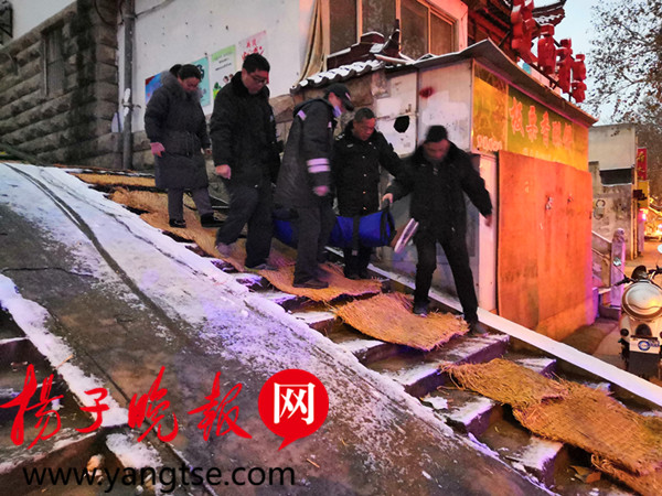 在此期间,中心调度又调派车辆,送草垫到老人家门口的斜坡阶梯上。很快,急救众人用草垫,铺出了一条“生命之路”。