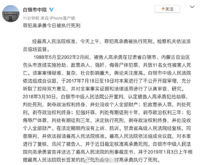 2018年3月30日,白银市中级人民法院公开宣判,认定被告人高承勇犯抢劫罪,判处死刑,剥夺政治权利终身,并处没收个人全部财产;犯故意杀人罪,判处死刑,剥夺政治权利终身;犯强奸罪,判处有期徒刑十年,剥夺政治权利三年;犯侮辱尸体罪,判处有期徒刑三年,决定执行死刑,剥夺政治权利终身,并处没收个人全部财产。在法定期限内没有上诉、抗诉。甘肃省高级人民法院经复核,同意原判,并依法报请最高人民法院核准。最高人民法院依法组成合议庭,对本案进行了复核,讯问了被告人,并于近日裁定核准高承勇死刑。白银市中级人民法院向高承勇宣告并送达了最高人民法院的刑事裁定书,并于2019年1月3日上午根据最高人民法院院长签发的执行死刑命令,对高承勇执行了死刑。