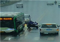 可以看到有一辆电动车,一直在机动车道行驶,在行驶到快靠近路口的时候,这辆电动车突然向马路中间转弯,走公交车的后面,突然逆向行驶,被迎面正常行驶过来的面包车撞倒。