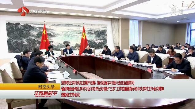 会议强调,坚持稳中求进工作总基调,保持经济持续健康发展和社会大局稳定,更要毫不放松地重农强农惠农,落实重中之重要求,稳住"三农"发展基本盘。要落实走在前列要求,推动"三农"发展高质量,不仅要做指标和进度上的领先者,也要做思路和路径上的引领者,还要做城乡融合发展和农业农村现代化建设上的探路者。要落实优先发展要求,抓好"三农"发展硬任务,对标高水平全面小康切实做好攻难关、补短板、抓弱项工作,特别是围绕苏北地区农民群众住房条件改善、农村人居环境整治、脱贫攻坚三项重点工作和乡村振兴十项重点工程,强化系统思维,全力啃下硬骨头、打好攻坚战。要落实党管农村要求,强化"三农"发展领导力,全面落实五级书记抓乡村振兴的要求,健全完善工作推进、规划实施、政策支撑、考核评估等体系,推动乡村振兴各项目标任务落细落实。