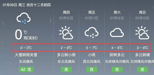 具体天气预报为:昨天傍晚全市多云,夜里多云转阴有小雨夹雪或小雪,今天白天全市阴有雨夹雪或雪,雨雪量中等,局部大,今天夜里阴有小雨夹雪转小雨,最低气温1℃,最高气温3℃到4℃;