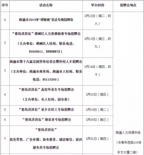 2019年春节即将来临,春节后历来是人才市场的活跃期,南通市人力资源市场为了应对求职招聘高峰,提前推出新春系列招聘活动,积极吸引返乡农民工、高校毕业生以及各类人才“落户”。招聘会时间表