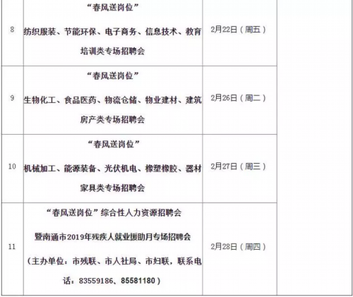 为期一个月的新春系列招聘活动期间,市人力资源市场将举办名企优岗、外经人才、残疾人、返乡农民工、高校毕业生、综合类以及机械加工、纺织服装、批发零售、生物化工等行业分类专场招聘会11场,有求职意愿的人员和有招聘需求的用工单位,可以登录南通人力资源市场网站查询具体招聘活动的日期安排。