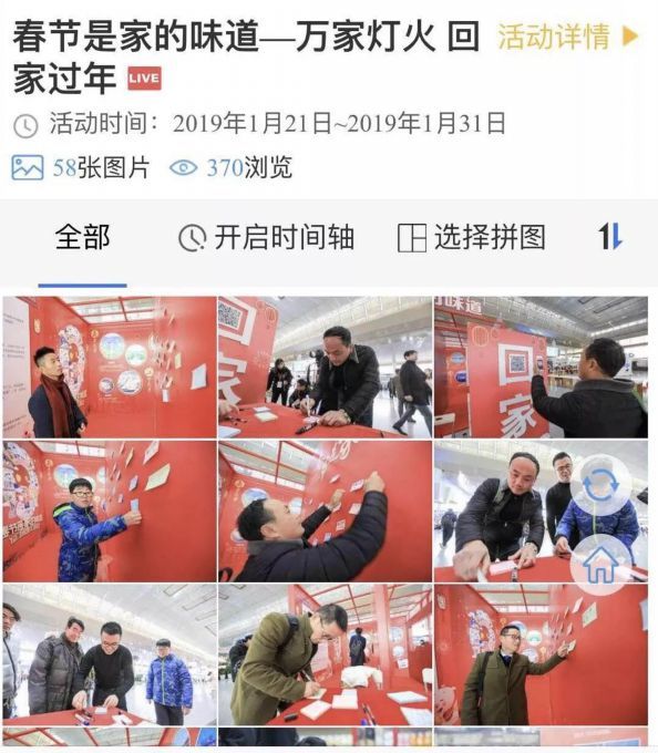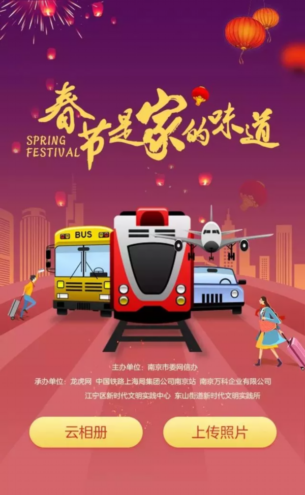 “春节是家的味道——万家灯火 回家过年”2019年春节回家公益快拍行动由中共南京市委网信办主办,龙虎网、中国铁路上海局集团公司南京站、南京万科企业有限公司、江宁区新时代文明实践中心、东山街道新时代文明实践所承办。