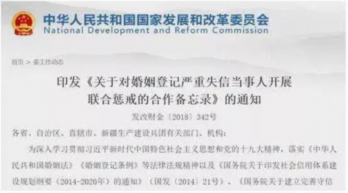 包括人民银行、公安部、民政部、工信部、发改委在内的31个国家部委联合印发了《关于对婚姻登记严重失信当事人开展联合惩戒的合作备忘录》,提出加大对婚姻登记领域严重失信行为的惩戒力度。