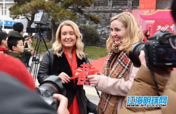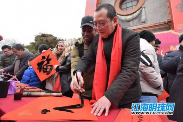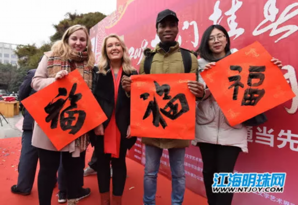现场浓浓年味也让在南通生活的外国友人,感受到了中国春节的喜庆氛围。揭联仪式后,来自英国、美国、南非、巴基斯坦、日本等8个国家的10多位外国友人还跟随丘石、张晏、周时君、徐贵明、朱单5位书法家现场学写“福”字。