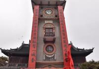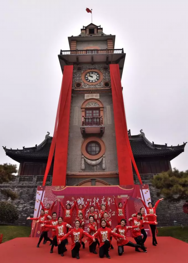 “江载风来,路接青云,碧水笑迎千里客;海蒸韵起,楼腾紫气,晨钟敲响一城春。”今天上午,伴着喜庆的乐曲,在中外友人的共同见证下,一幅12米长的巨幅春联亮相在了历经百年风雨的南通钟楼上,整个南通城显得喜气洋洋,年味十足。