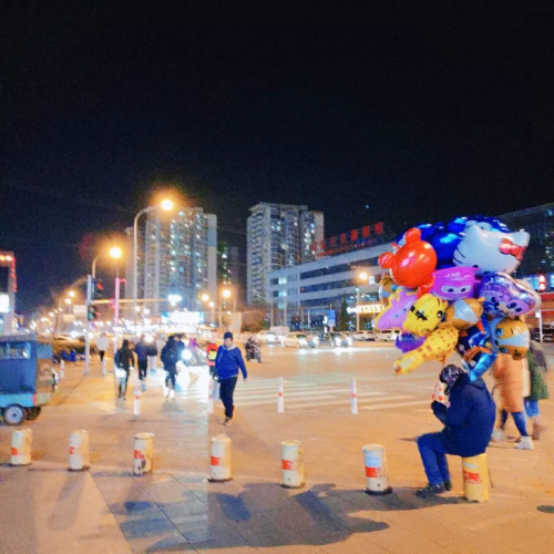 冬日的夜晚,人来人往,攒着一把气球的老人坐在一旁等候,却鲜有买家。都是为了生活啊,又有谁是容易的呢?