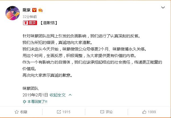 2月1日上午,“咪蒙”微博发布道歉信,信中写道:“针对咪蒙团队在网上引发的负面影响,我们进行了认真深刻的反省。我们为所犯的错误,真诚地向大家道歉。我们决定从今天开始,咪蒙微信公众号停更2个月、咪蒙微博永久关停。用这个时间,全面反思,积极调整,为大家提供更有价值的内容。作为一个有影响力的自媒体,我们应该承担起相应的社会责任,传递更正能量的价值观。再次向大家表示真诚的歉意。”