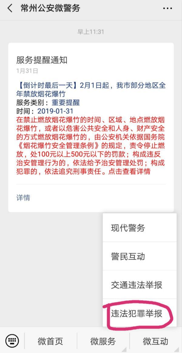 市民在发现违规燃放烟花爆竹行为时,除了可以直接拨打110外,还可以关注微信公众号“平安常州”或者“常州公安微警务”进行举报。具体操作步骤如下:点击“微互动”栏目,选择“违法犯罪举报”页面,进入举报信息填写页面,根据提示填写相关信息并上传手机所拍摄的照片或视频,最后点击提交。