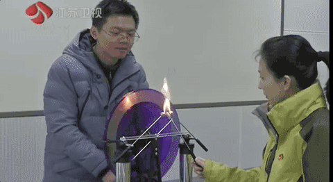△当转动静电起电机时,火苗一下子蹿了起来。