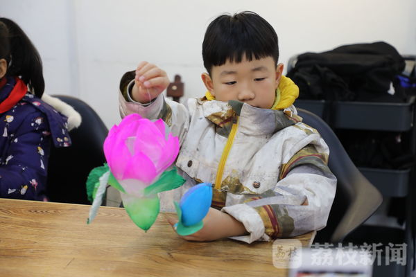 孩子们完成了花灯的制作,迫不及待地和自己的作品合影留念。