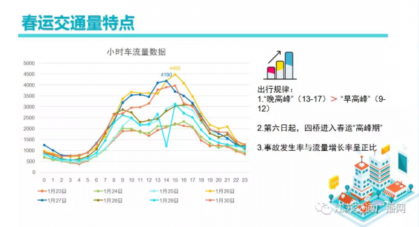 根据前10日小时车流量数据可以看出“晚高峰”(13-17时)出行车辆要高于“早高峰”(9-12时),1月26日(春运第六天)起,南京四桥也正式进入“春运高峰期”,春运错峰出行,选择四桥过江是避免拥堵的不错选择。