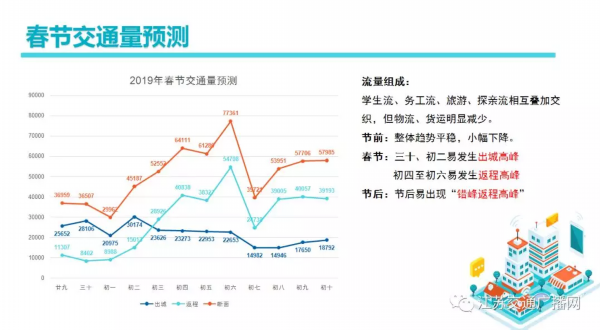 大流量将出现在三个阶段:“2月4日、6日出城小高峰”、“2月8日至2月10日返程高峰”、“2月12日至2月14日节后错峰返程高峰”。