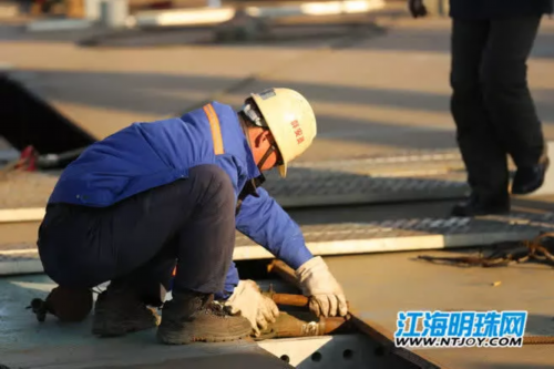 “现在进行的是27号辅助墩首轮墩顶钢梁的架设,已装钢梁和待装钢梁每个断面之间需由6000多套高强螺栓进行连接固定,我必须时刻盯着钢梁,不能有一点偏差,精度要求非常高,偏差不能超过1毫米。”李杰说,往往一盯就是半个小时,还要注意四面八方,防范哪边有触碰的危险,同时,由于架设受潮位高低起伏影响很大,对时间的把控也很重要。