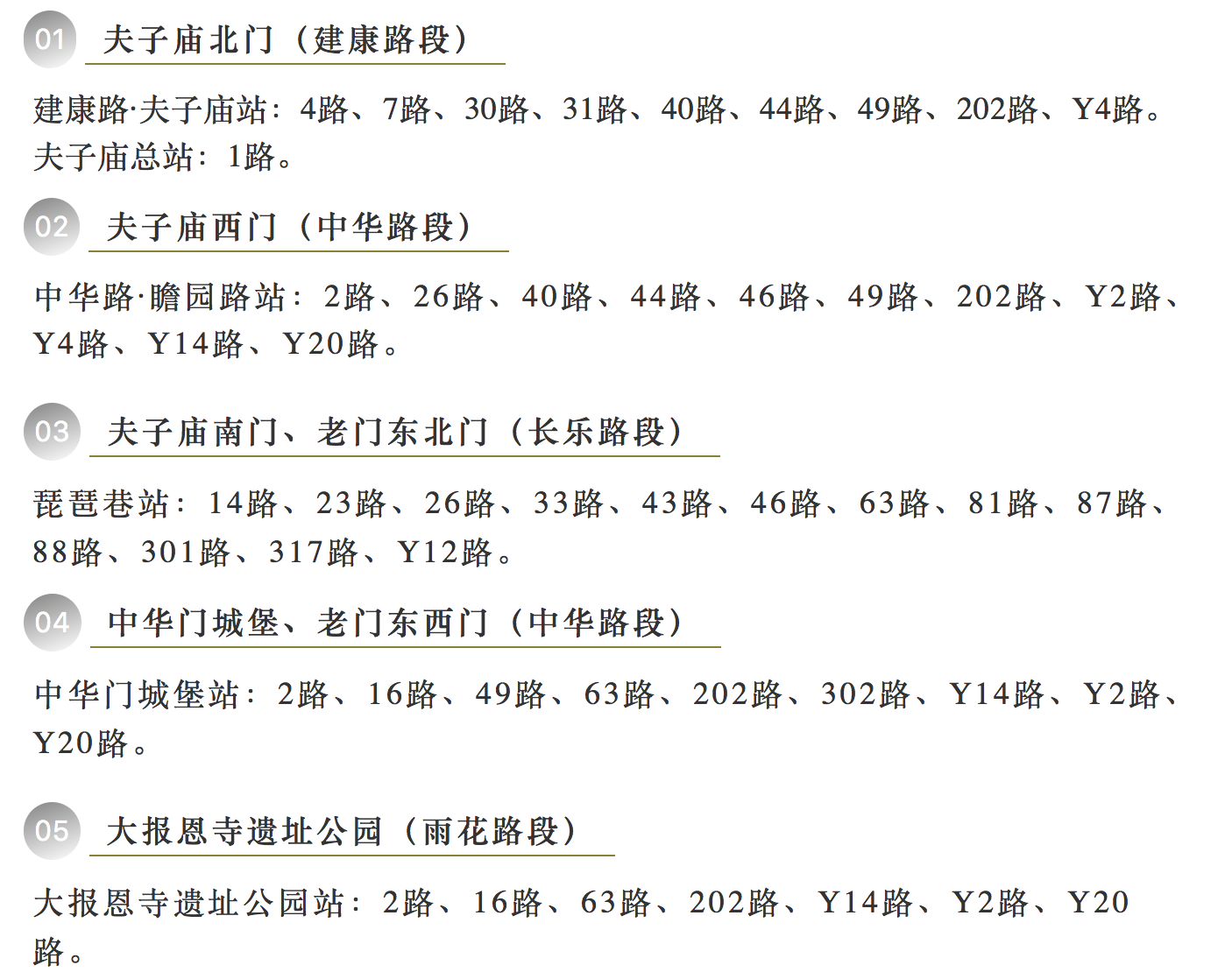 在正月十四、十五两天,公交、地铁跳站运行,夫子庙核心景区单向通行。期间,地铁1号线三山街站和3号线夫子庙站每天17:30至21:00跳站,地铁3号线常府街站和武定门站每天18:30至21:00跳站。进入夫子庙地区的公交车,将提前下客清空车辆,空车驶往夫子庙带客返程,提前下客站点为杨公井站(并根据人流情况适时扩大至大行宫站)、升州路站、中华门站。