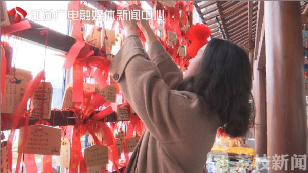 记者在大报恩寺遗址公园南画廊的报恩祈福区看到,不少市民和游客携家带口写上一份祝福的话挂在这里,表达对新年的美好祈愿。