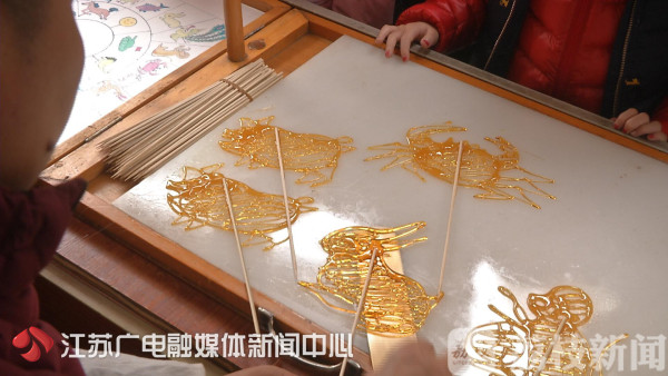 在老门东,年味还体现在一个个"非遗"老手艺里。面塑、泥塑、吹糖人,让你瞬间找回儿时的记忆。在糖画摊位前,糖画艺人以勺为笔,以糖做墨,不一会,一个个栩栩如生的动物形象就从糖画艺人的手里诞生。今年是猪年,小猪糖画格外受欢迎,糖画艺人告诉记者,最近几天每天他都要画上近200只“糖猪”,也让南京的年味更加有“甜蜜”的味道。