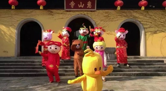 五福临门,福禄寿喜财神们携手猪猪侠、轻松熊、小黄鸭等萌宠,为游客上演欢动舞蹈,并向游客派发惠山古镇景区定制的吉祥礼物。