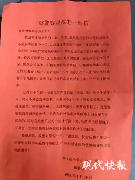 摘录:记得前不久的一场暴风雪严重影响了交通,那一天下午放学后,迟迟不见爸爸来接我,看着同学们一个个地被家长接走,天越来越黑,风雪越来越大,天气越来越冷,我开始害怕了。是您打通爸爸电话并告诉我,爸爸在来接我的路上,是因为堵车才迟到的。这时我焦虑不安的心情才平静下来。虽然天已经很晚了,但是您一直守护在我身旁,直到爸爸接到我以后您才下班回家。警察叔叔,我想对您说一声:"谢谢您,长大后我也要做一位像您这样可爱可敬的人!