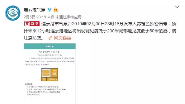 据江苏气象消息,昨夜到今天全省大部分地区有雾或浓雾。@连云港气象 也在昨天晚上发布了大雾橙色预警信号,预计未来12小时连云港地区将出现能见度低于200米局部能见度低于50米的雾。