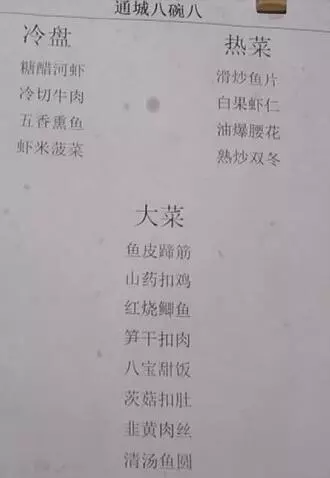 八大碗菜没有稀奇的食材,却能把畜禽水产二十几种食材汇于一宴,酸甜咸鲜四味备于一席,凝聚着南通人的生活艺术。