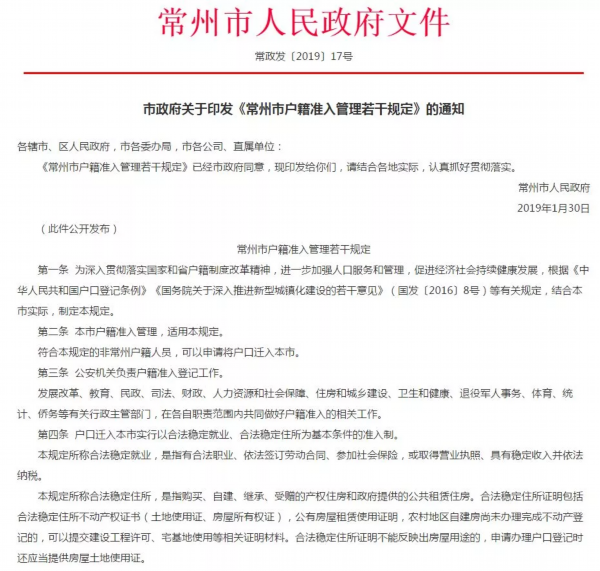 2019常州落户政策放宽!