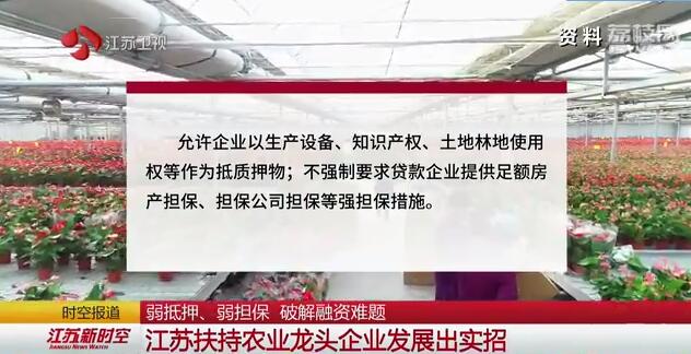近日,省农业农村厅、省财政厅、中行江苏省分行共同签署"鑫农贷"农业产业化龙头企业融资风险补偿基金合作协议,缓解省级及以上农业龙头企业融资难题。"鑫农贷"突出强调弱抵押、弱担保的特点, 允许企业以生产设备、知识产权、土地林地使用权等作为抵质押物,助力企业做大做强。