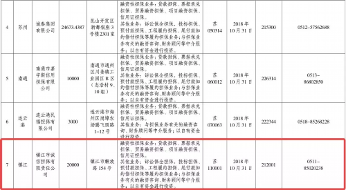 江苏经纬投资担保有限公司、南通市嘉宇斯信用担保有限公司、连云港民福担保有限公司、镇江市诚信担保有限责任公司、镇江市融资担保有限公司、丹阳市阳光担保投资有限公司、江苏鑫润担保有限公司。其中,丹阳市阳光担保投资有限公司失信黑名单次数高达43次。