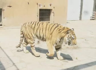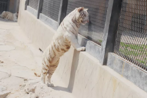 调皮的小白虎,攀着围栏好奇地偷看邻居的生活~