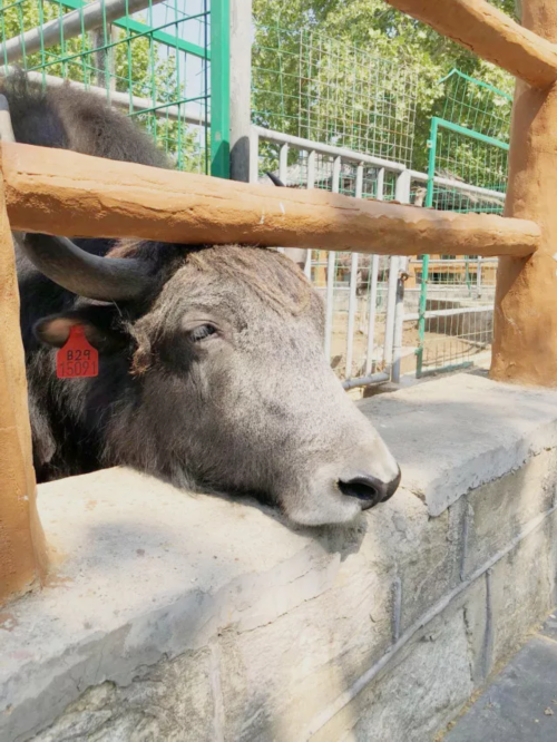 牦牛把下巴搭在围墙上,惬意地享受初夏温暖的阳光。