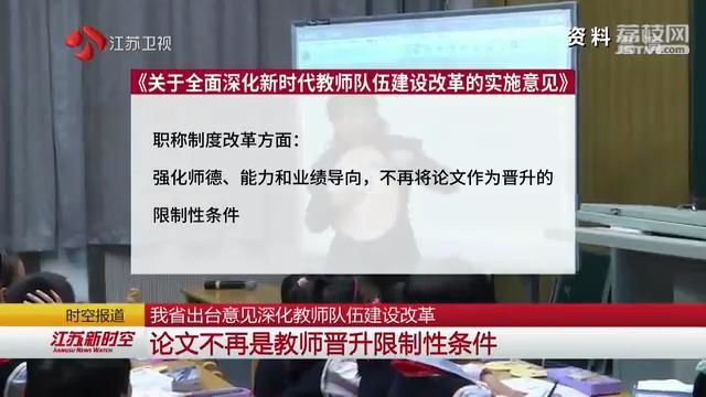 为进一步提升教师队伍总体水平,近日,江苏出台《关于全面深化新时代教师队伍建设改革的实施意见》,其中,明确不再将论文作为教师晋升的限制性条件。