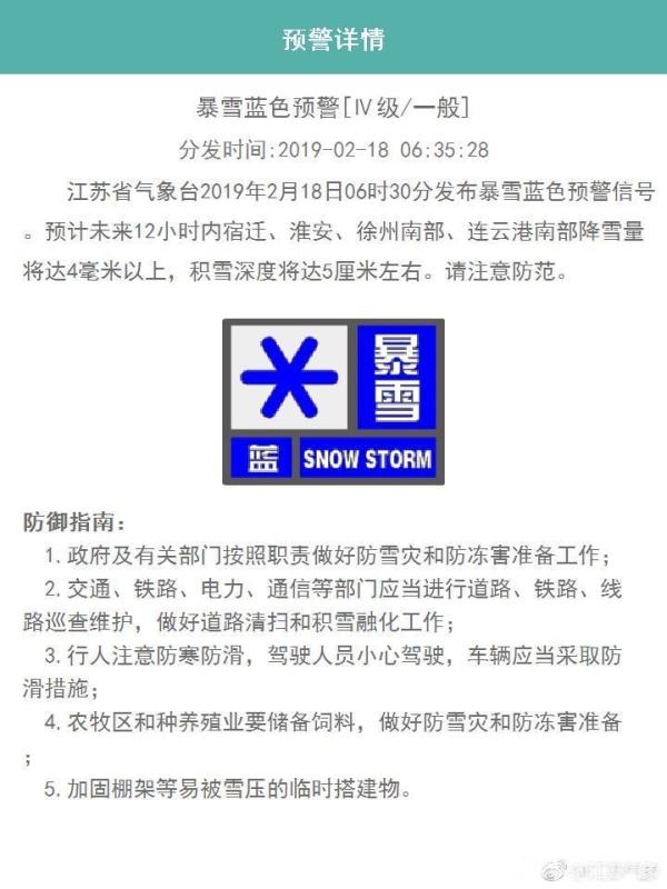 江苏省气象台2019年2月18日06时30分发布暴雪蓝色预警信号。预计未来12小时内宿迁、淮安、徐州南部、连云港南部降雪量将达4毫米以上,积雪深度将达5厘米左右。请注意防范。