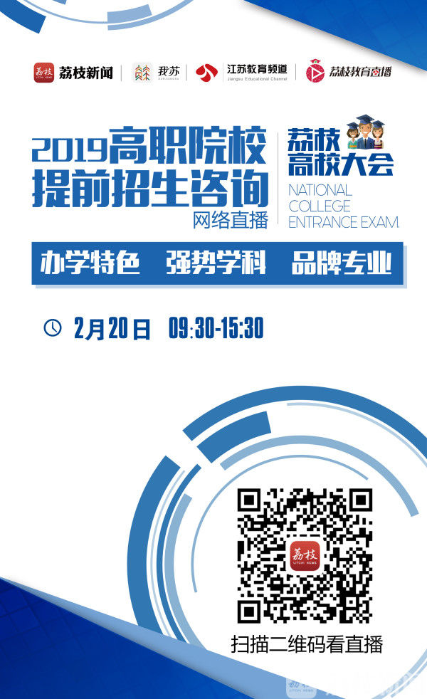 据我苏网 各位准高考生注意了,江苏省高职院校提前招生就要开始报名了!不用参加高考也有机会被高职院校录取,什么样的人可以报名呢?2月20日上午9:30开始,2019荔枝高校大会·高职提前招生咨询网络直播活动邀请省内多家明星高职院校走进演播室,为高三的你,现场答疑。详情>>