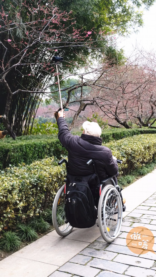 坐着轮椅也不妨碍与春天合影,来,自拍一张!