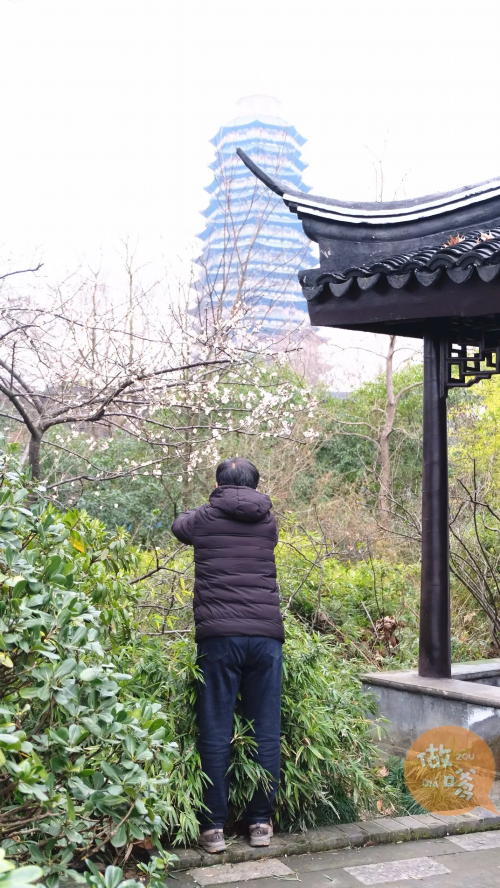 你在拍梅花,我在拍你,大叔身上的羽绒服和远处的宝塔神奇撞衫了!