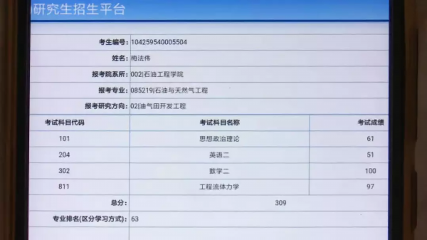 2月15日,研究生成绩可以查询了,老家在沛县的梅法伟,在手机上查到了自己的分数:309分。这个分数,本意味着他可以进入到报考学校专业的研究生复试,甚至可以说能进入到心仪的高校继续深造。