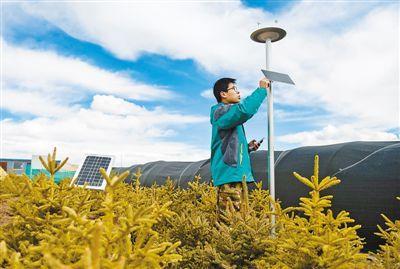 图为在“那曲高寒地区植树重大科技攻关项目”试验基地,绿化工程师在查看气象站大数据自动监测设备(摄于2018年3月)。