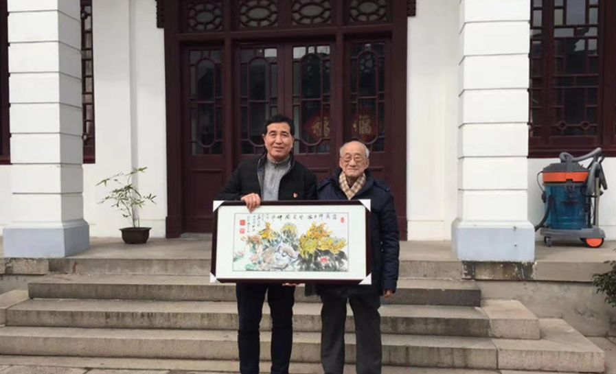 2月28日上午,姑苏区平江街道拙政园社区93岁的居民施文潮在社区工作人员的陪同下来到狮子林,把亲手创作的水彩画《菊韵》赠予狮子林管理处党支部,表达一名老苏州对苏城美景的欢喜之情。