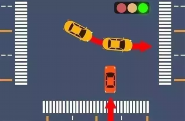 6、相对方向行驶的右转弯的机动车让左转弯的车辆先行。