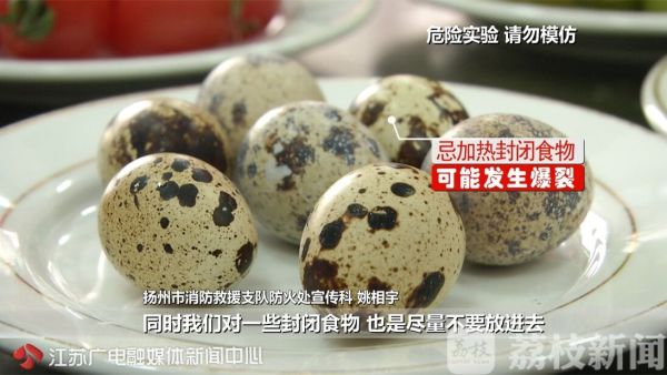 扬州消防体验员姚幺九提醒:“切记不要把油炸类的食物放到微波炉内,因为油类食物受热后会产生沸溢喷溅;同时也不要将铁制品、普通塑料制品放到微波炉里面,因为铁制品会造成热量不能及时有效传导,可能影响电磁元件,普通塑料制品加热后会容易变形;同时一些封闭食物也尽量不要放进微波炉,以免产生内部高温受热膨胀,产生爆炸现象。”