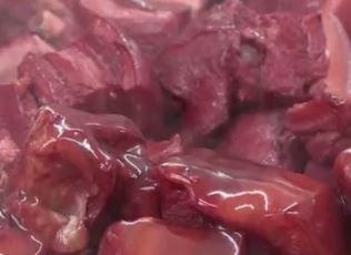 放在水里一化,色素和红曲粉的区别非常明显,色素入水即化,颜色鲜艳。而红曲粉需要搅拌,颜色偏暗。随后,把三种着色的原料分别放入三个烧肉的锅中,除了颜色有特别明显的红,业内人士指出来,红曲米会跟肉当中的蛋白质产生反应,所以瘦肉的地方会产生一条红线,但是肥肉的地方还是白的。如果是色素烧的,肥膘的地方也会产生红色。