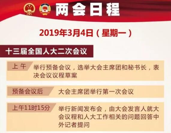 新华社图表,北京,2019年3月3日 图表:3月4日两会日程 新华社记者 施鳗珂 编制 新华社北京3月3日电 3月4日上午,十三届全国人大二次会议举行预备会议,选举大会主席团和秘书长,表决会议议程草案。预备会议后,大会主席团举行第一次会议。上午11时15分,十三届全国人大二次会议举行新闻发布会,由大会发言人就大会议程和人大工作相关的问题回答中外记者提问。 全国政协十三届二次会议全天进行小组讨论,审议全国政协常委会工作报告和提案工作情况报告。