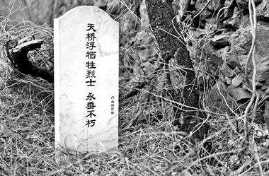 在广告牌旁的沟渠内,北青报记者看到刻着“天桥浮牺牲烈士永垂不朽”的石碑。据《京西军事遗址》记载:1948年国民党青年军208师5团一部驻守天桥浮,并修建碉堡等军事设施。同年腊月初三,北岳军分区独立团奉命攻打驻守在天桥浮的国民党军,以牵制敌军增援南口主战场。夜间10点整战斗打响,天亮结束,双方伤亡上百人。战斗结束后,天桥浮战斗牺牲的战士被埋葬在宅舍台村附近。1993年,在坟墓中间建立纪念碑,正面写“革命烈士之墓”,背面写“天桥浮战斗中牺牲的烈士永垂不朽”。