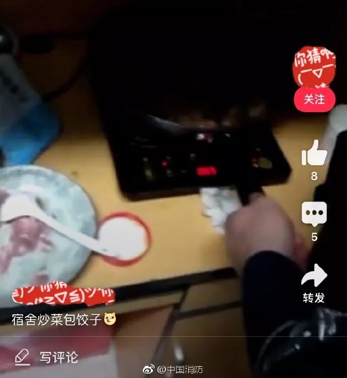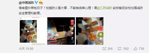 @中国消防:宿舍里炒菜包饺子?校园防火是大事,不能有侥幸心理!请@江苏消防 安排督促该校加强消防安全管理和教育。