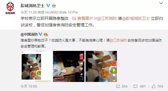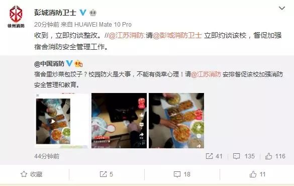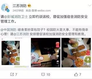10点15分,@江苏消防:请@彭城消防卫士 立即约谈该校,督促加强宿舍消防安全管理工作。