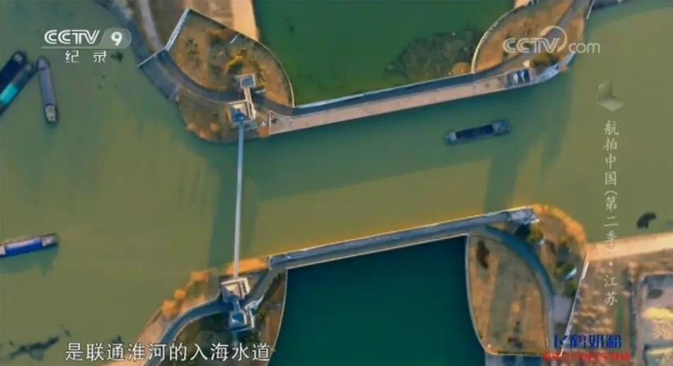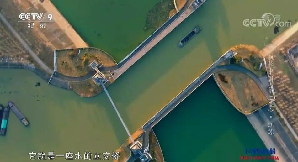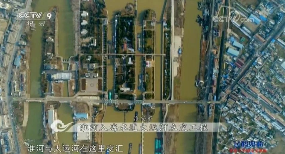 上部的京杭运河航槽横跨在淮河入海水道之上,两条水道立体交叉,上行大运河,下行入海水道,互不干扰。