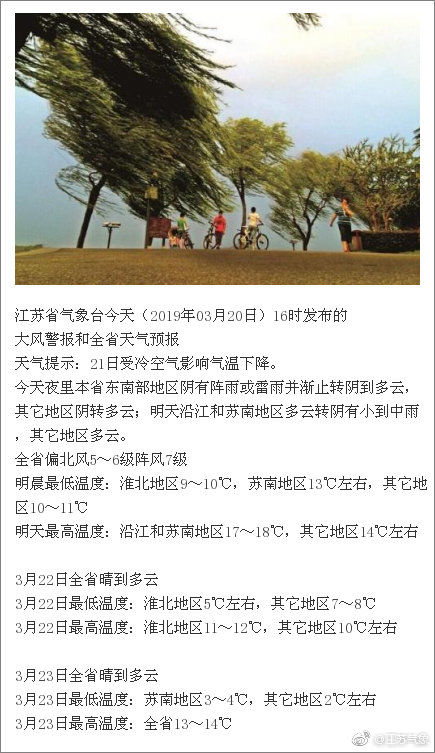今天夜里本省东南部地区阴有阵雨或雷雨并渐止转阴到多云,其它地区阴转多云;明天沿江和苏南地区多云转阴有小到中雨,其它地区多云。全省偏北风5~6级阵风7级,明晨最低温度:淮北地区9~10℃,苏南地区13℃左右,其它地区10~11℃,明天最高温度:沿江和苏南地区17~18℃,其它地区14℃左右。